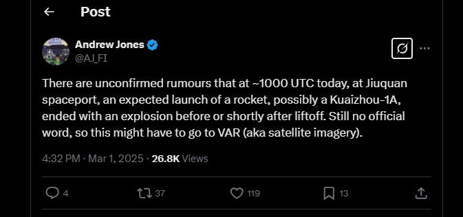 A Kuiazhou 1A (KZ-1A) three-stage solid rocket was set to launch on 1 March at about 1001 GMT from Jiuquan, China. However, whether it made it off the pad intact was called into question after reports gained traction that KZ-1A suffered an explosive failure.An increasing consensus among space industry experts, on X at least, has emerged that KZ-1A exploded either immediately before, or just after, ignition on the pad.Astronomer and space flight guru Jonathan McDowell, space journalist Andrew Jones, Chinese spaceflight observer ‘Cosmic Penguin’ and space news outlet Rêves d'Espace are some of the expert sources that picked up on the possibility of a failed KZ-1A launch.[caption id="attachment_122425" align="alignnone" width="673"]
